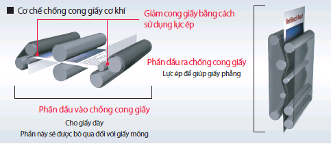 Chống cong giấy dạng cơ khí: hệ thống ứng dụng cơ chế cuốn ép giấy theo đường zíc zắc, lực ép có thể điều chỉnh đến 5 cấp độ nhằm loại bỏ tình trạng cong giấy một cách tối ưu.