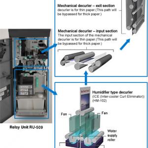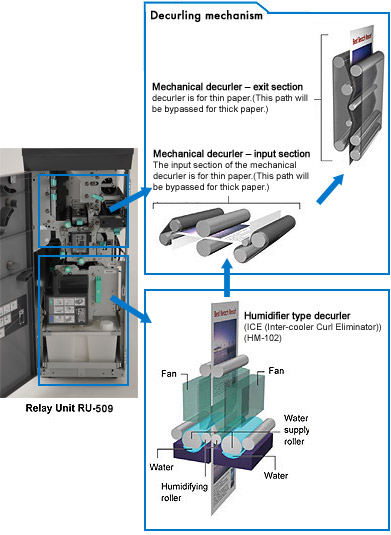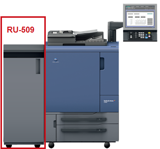 RU-509 là bộ đệm giấy chờ, làm nhiệm vụ chứa giấy và điều chuyển giấy sau in đến các hệ thống hoàn thiện sản phẩm khác. Ngoài ra, RU-509 còn có các chức năng ưu việt như: chống cong giấy dạng cơ khí, chống cong giấy dạng làm ẩm (với tùy chọn phụ bộ làm ẩm HM-102), chức năng cân chỉnh màu tự động bằng hệ thống cảm biến.